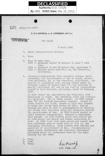 "Steaming independently with returning troops, naval personnel, and ex-prisoners of war on board, en route from Hollandia, NG, to San Francisco, California. ... At dawn vessel was approaching San Francisco, with Farallones in sight. Day extremely clear and visibility excellent. Met by blimp escort. As 0806 passed Buoy "A" and entered mine-swept channel; thence to pilot station for pilot, thence up Main Ship Channel to under the Golden Gate Bridge at 1001. Passed through the nets as 1012 to accompaniment of whistles and sirens from welcoming ships and reception parties for ex-prisoners of war. At 1036 dropped anchor to await berthing instructions. Reception committees came aboard. As 1135 docking pilot came aboard and at 1148 anchor was aweigh and vessel proceeding to dock. At 1210 first line went ashore and vessel made fast starboard side to south side of Pier 15, San Francisco, California. Dock crowded with friends and relatives of ex-prisoners of war. Dis-embarkation began almost immediately and continued throughout afternoon until all passengers were off the ship. Liberty for the crew."