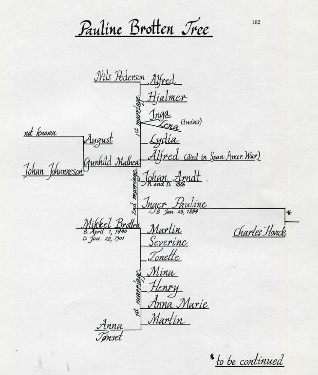 For months now, ancestry.com has been showing me a particular woman named Karoline Pederson as a potential half-sister of Pauline Braaten (later Brotten), my maternal grandmother. However, she is not on the family tree that my aunt Mildred created, so I've been dismissing the idea.